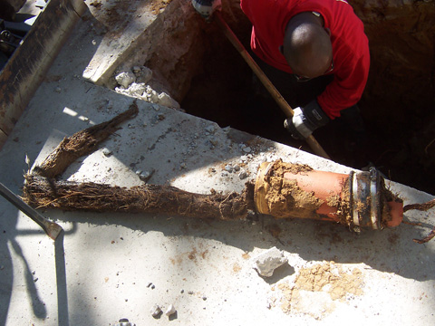 - Root Infiltration — tree or shrub roots have invaded the sewer line, preventing normal cleaning and/or have damaged the line.